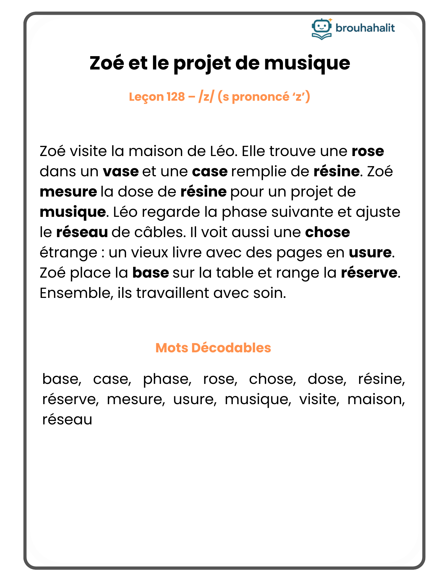 Here’s a real example from Lesson 128, targeting the phoneme /z/ as pronounced in words like rose and musique.