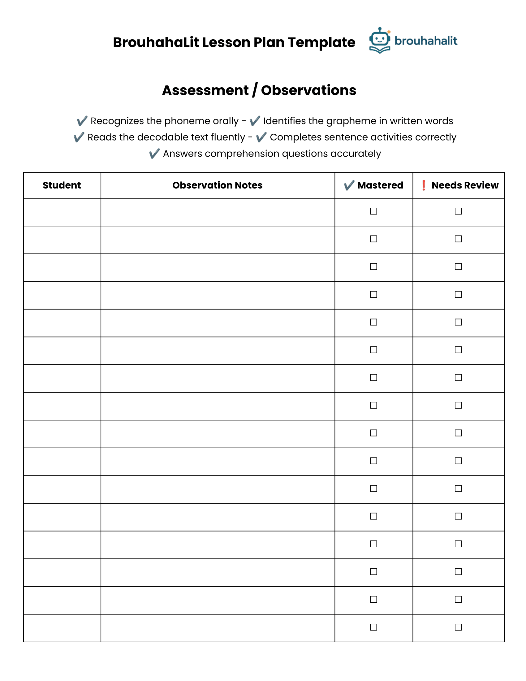 Each lesson includes a printable observation chart so you can track student mastery of: